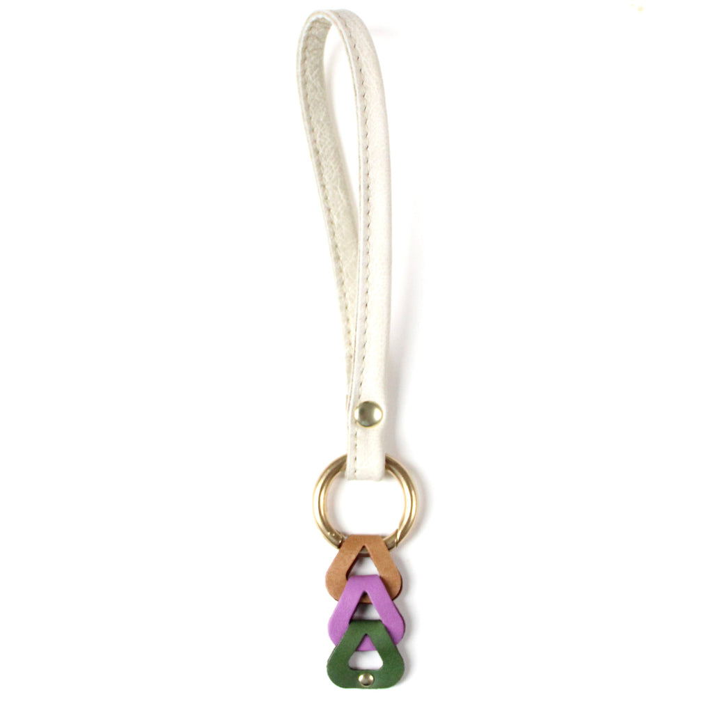 created to be bold and functional statement pieces. each one has a leather wristlet attachment, and a unique combination of interlocking leather pieces to celebrate the beauty of color! the brass spring-loaded o-ring can easily be opened to add your own key ring. you can also opt to clip to your favorite everyday bag.
