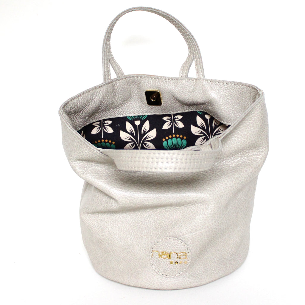 the little bucket is simple, timeless and pretty. each bag has double short handles for a feminine grab-and-go vibe. the interior is fully lined in a coordinating print, and a magnetic snap closure keeps the contents secure, while still allowing easy access to your goods. the special cut-out opening at the base of each handle is created for a unique aesthetic, but also plays a secondary role, allowing you to add your own bag clip (nana makes some lovely ones!) for extra oomph.