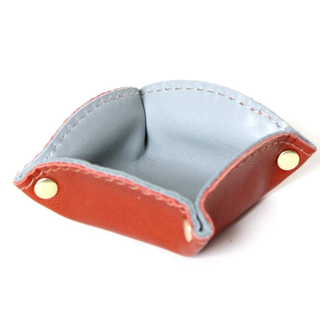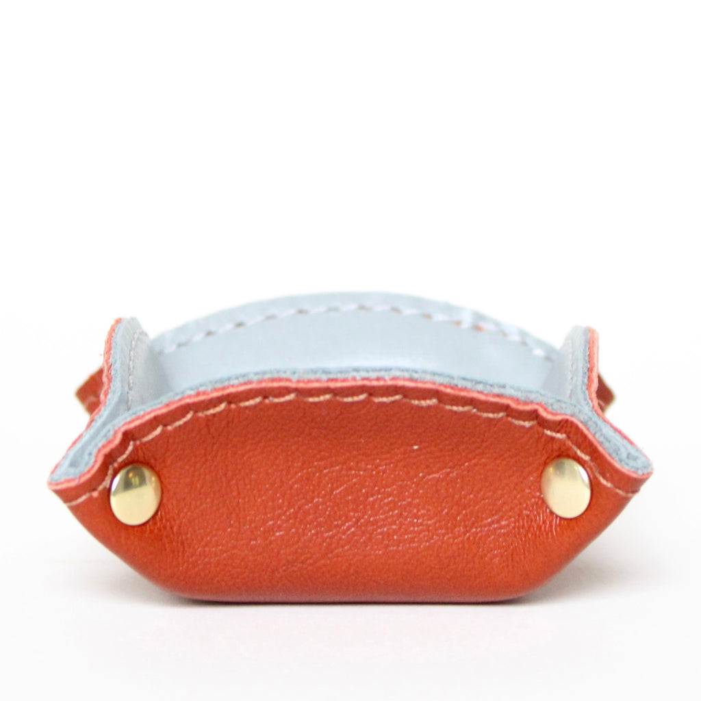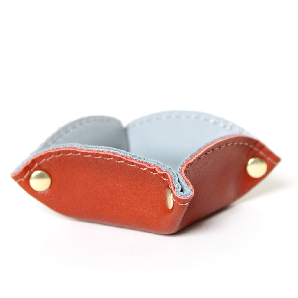 each tray is ideal for holding your most treasured little items. pop them anywhere -- on your bedside table, your dresser, your entryway table, etc.... each one features two different colored leathers (one exterior, and one interior) stitched together, and hold their shape with 4 brass rivets.