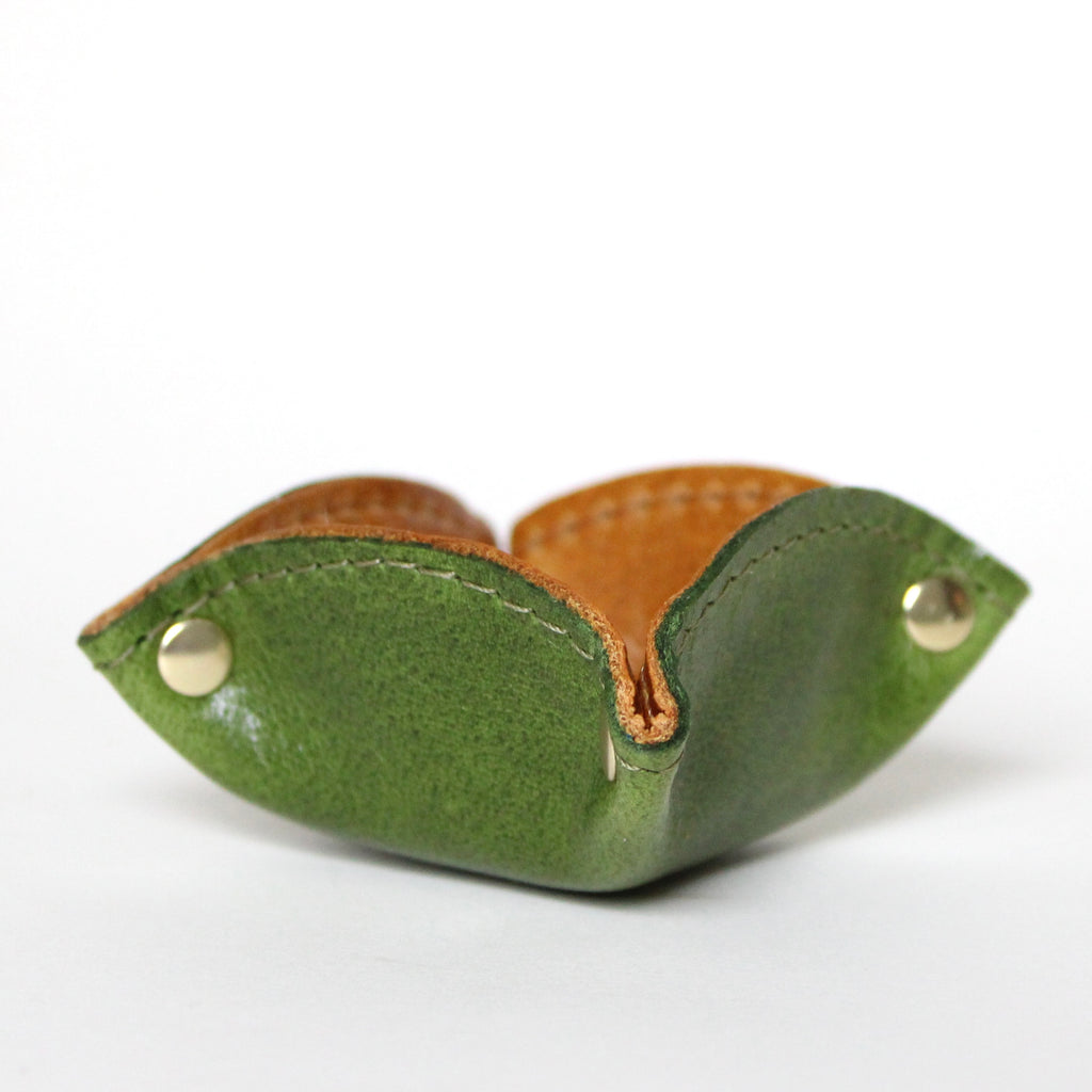 each tray is ideal for holding your most treasured little items. pop them anywhere -- on your bedside table, your dresser, your entryway table, etc.... each one features two different colored leathers (one exterior, and one interior) stitched together, and hold their shape with 4 brass rivets.